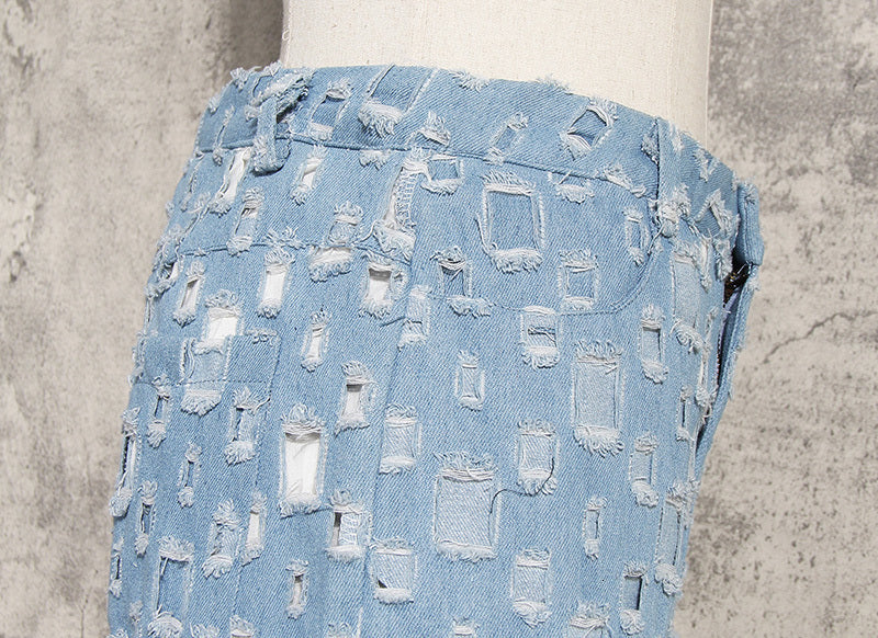 • Hollow Out Wide Leg Pants Women High Waist Ripped Jeans Denim Fashion- Young Fashion