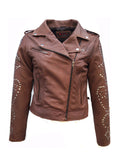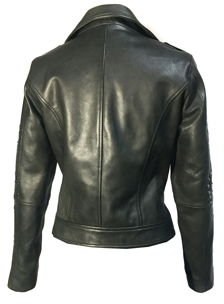 • Vanna Woman Leather Moto Biker Jacket Studded Sleeve