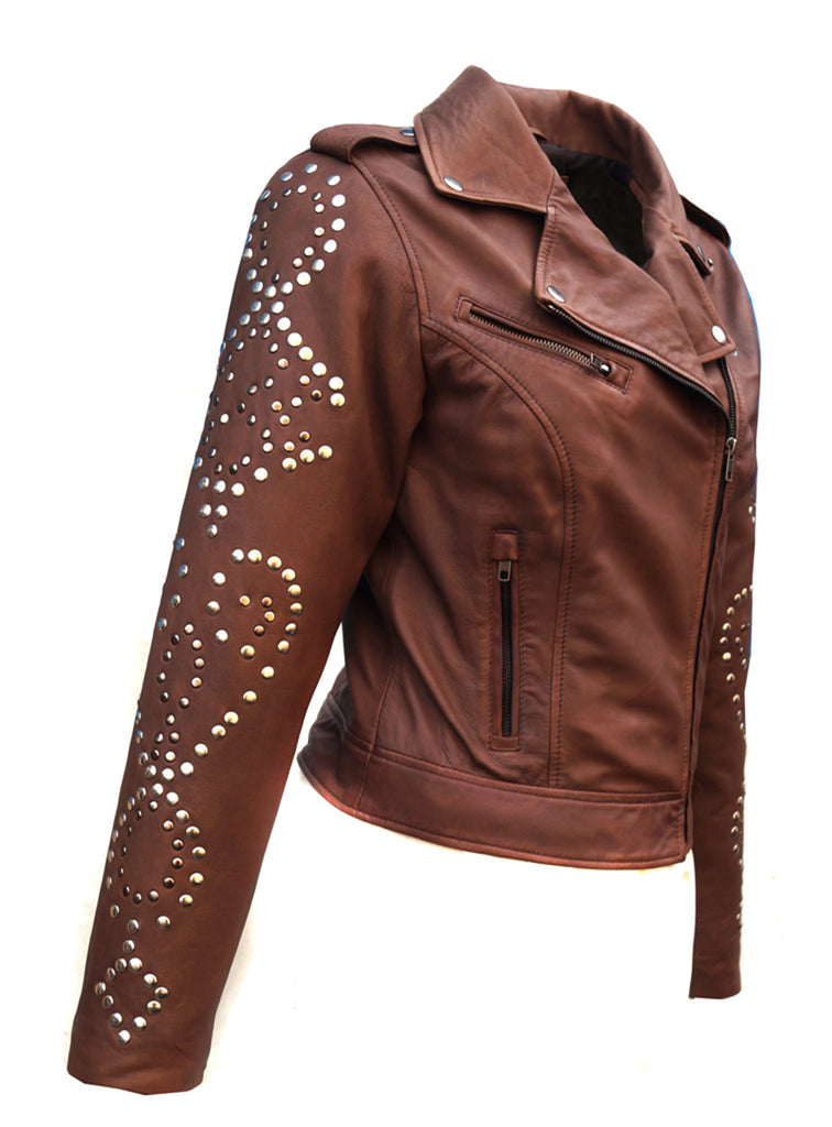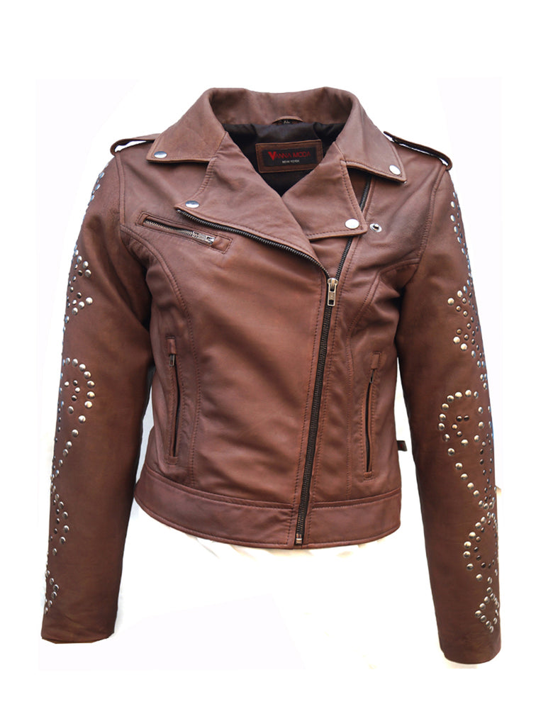Vanna Woman Leather Moto Biker Jacket Studded Sleeve