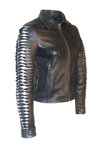 Leather Christmas Vintage Motorcycle Biker Women Jacket with Metallic Silver Padded Sleeve