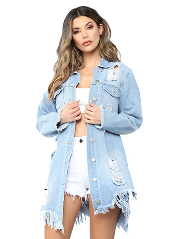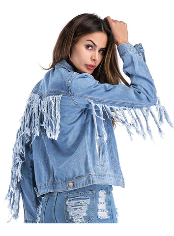 Spring And Summer Street Fashion Women Fringes Design Blue Denim Jacket/Shirt Jacket