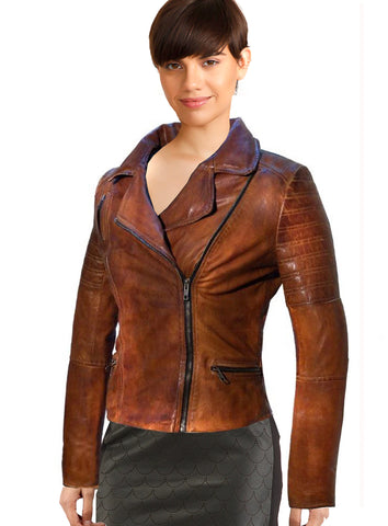 Women Lamb Leather Abstract Handcrafted Sleeve Dip Dyed Vintage Look Biker Jacket