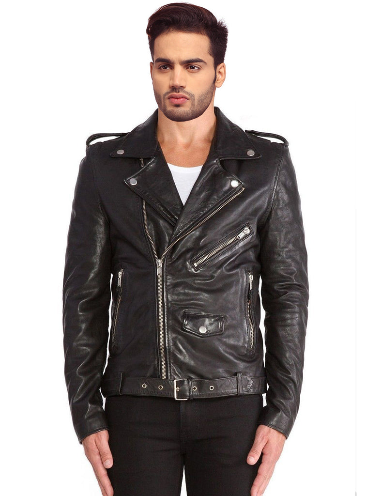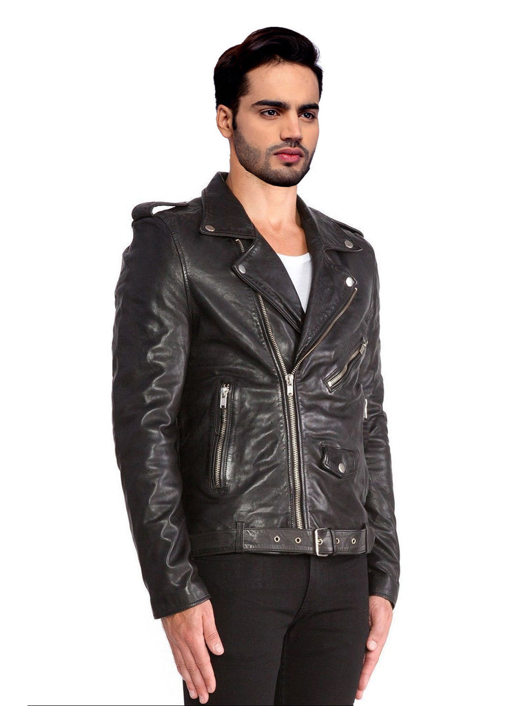 Men Washed  Classic Motorcycle Biker Leather Jacket with multi Zipped Pockets is designed with zipped sleeves, zipped pockets.  Men Biker Jacket is styled with heavy chunky zippers at sleeves, center front and sleeves. Men Biker Jacket is styled with enclosed zipped front and zipped pockets. Men Classic Washed Motorcycle Biker Leather Jacket for all age groups. The jacket is having Classic Styling with center front enclosed zippers.