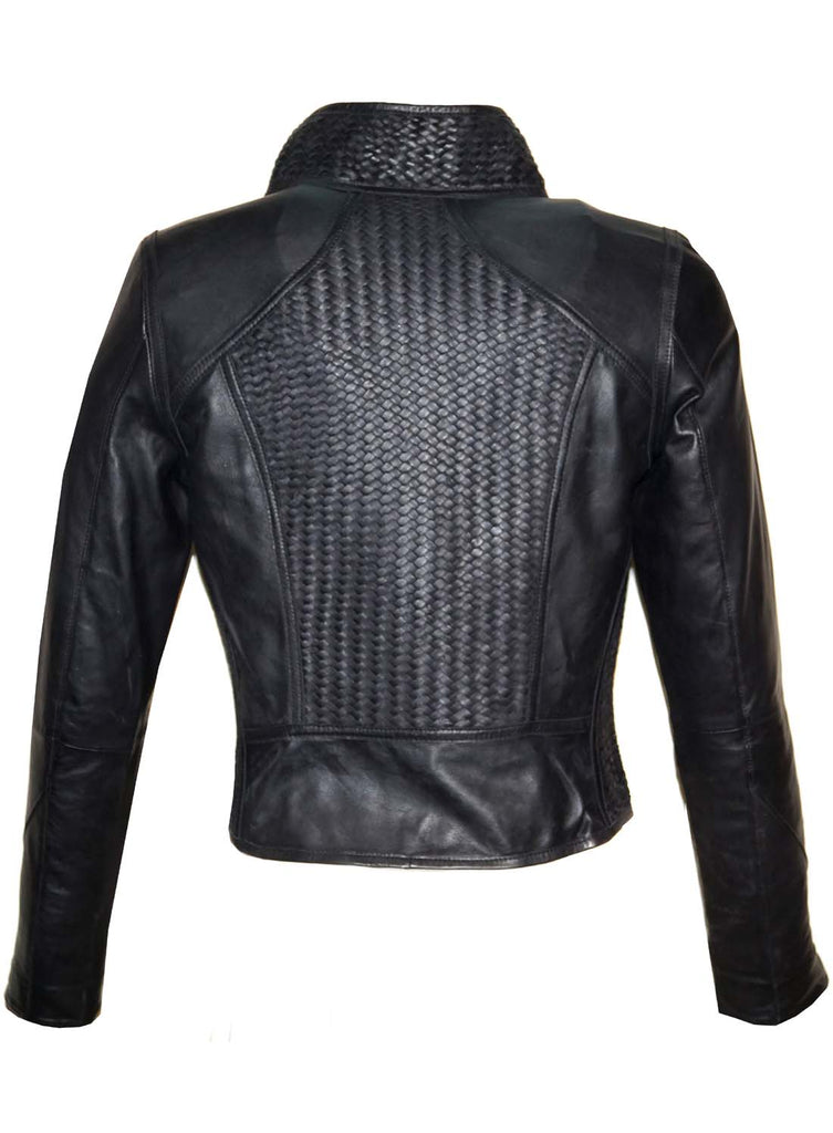 Vinni Woman Leather Jacket with leather weave at front and back panels.
