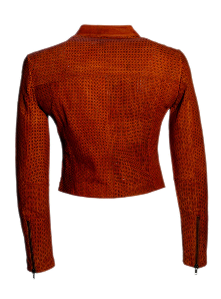 VannaModa Designer full Perforated Leather Women Jacket is styled with full perforation body. Designer Jacket is styled with standing collar and snap button. Leather designer Jacket is unlined and is good for summers.